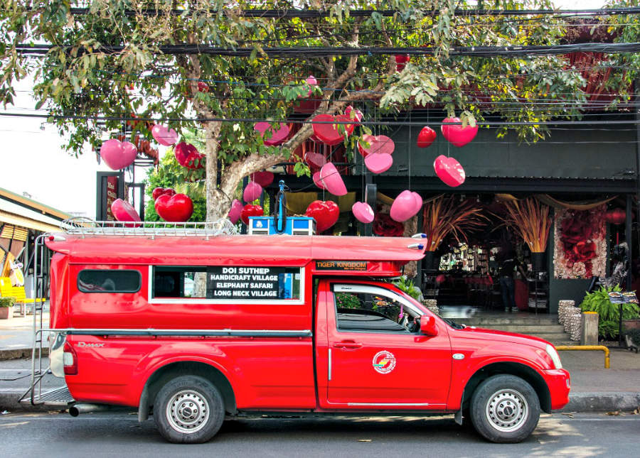 A Chiang Mai se non hai un auto pick-up non sei nessuno! Persino gli autobus e i taxi per turisti sono pick- up ed hanno anche un loro nome. Si chiamano songthaew e ce ne sono di due colori: rossi per i turisti e gialli per i residenti del luogo. Prima di salirci cercate sempre di contrattare il prezzo con l’autista.