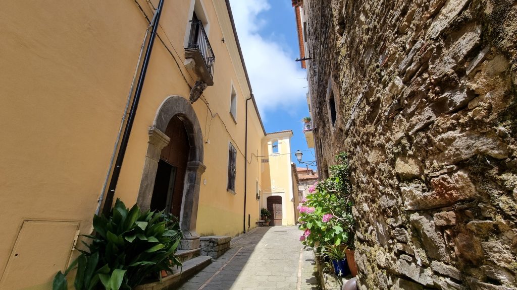 Pisciotta è un piccolo gioiello incastonato tra le colline del Cilento e il mare. Il borgo si sviluppa come una spirale di pietra, salendo tra viuzze strette e scalinate, fino a svelare scorci improvvisi sulla campagna e sulla costa. Passeggiando tra le sue strade, ci si ritrova immersi in un’atmosfera sospesa, fatta di silenzi, archi antichi e facciate segnate dal tempo. Il centro storico, con i suoi edifici nobiliari e le chiese raccolte, racconta un passato ricco di storia e fede, ancora vivo nel ritmo lento della vita quotidiana.