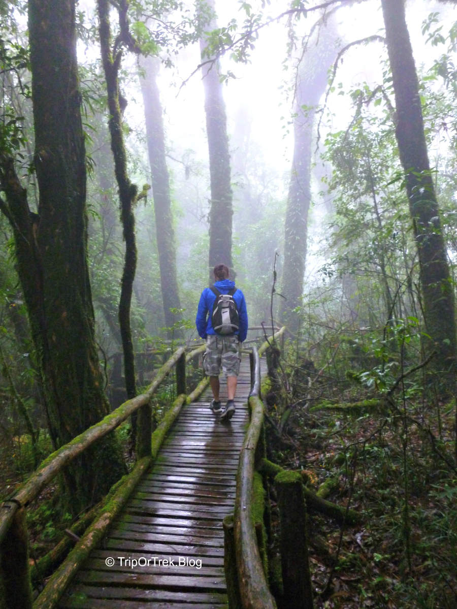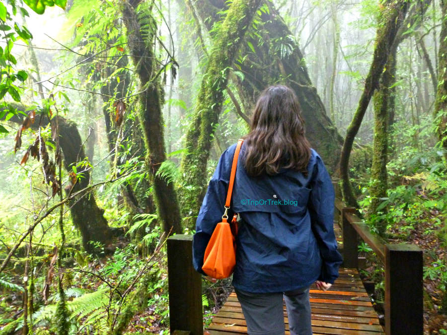 Non potendo ammirare i giardini di rose ai piedi delle pagode ho intrapreso un trekking nel fitto della foresta pluviale. Una piccola passerella in legno delineava il percorso da seguire in quel labirinto di rami, muschio e nebbia.