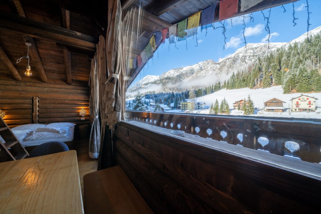Il cuore del Eirl Dolomites Retreat Sappada è l’edificio principale che ospita la reception e l’Alp Stube, uno spazio intimo e accogliente pensato come punto di incontro per ospiti e visitatori. Qui la filosofia di Silvia e Max si riflette in ogni dettaglio: solo cinque tavoli, candele accese nelle serate invernali e un sottofondo di musica jazz che accompagna momenti di convivialità in un’atmosfera sospesa nel tempo.