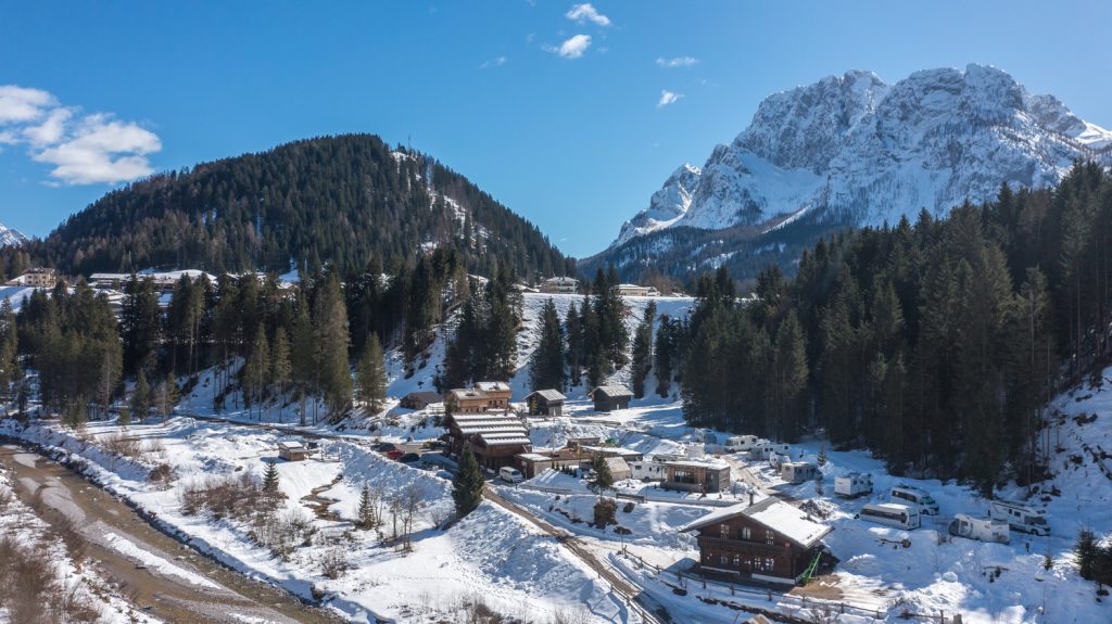 Gli spazi del retreat sono stati progettati per garantire privacy e comfort a ogni ospite. Un ponticello in legno separa l’area degli chalet da quella dei camper, creando un’atmosfera intima e riservata. In inverno, proprio sotto il ponte, passa la pista da sci di fondo, regalando un suggestivo colpo d’occhio che richiama le tradizioni delle Alpi. Anche le case mobili e le piazzole sono posizionate con attenzione, in modo da preservare la riservatezza degli ospiti e valorizzare la vista sulle Alpi di Sappada.