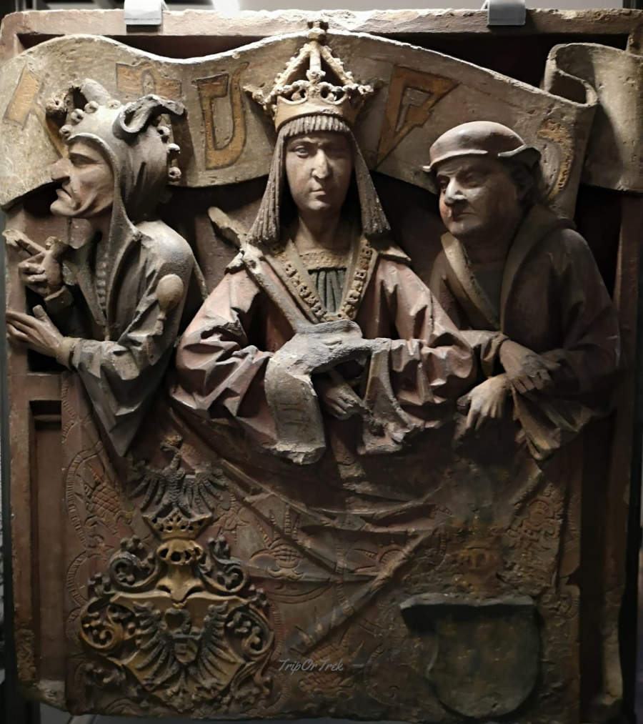 La sua immagine di regina triste è raffigurata in un bassorilievo conservato nel palazzo del Tettuccio D’oro dove appare insieme all’imperatore e alla sua sua amatissima e mai dimenticata prima moglie Maria di Borgogna.