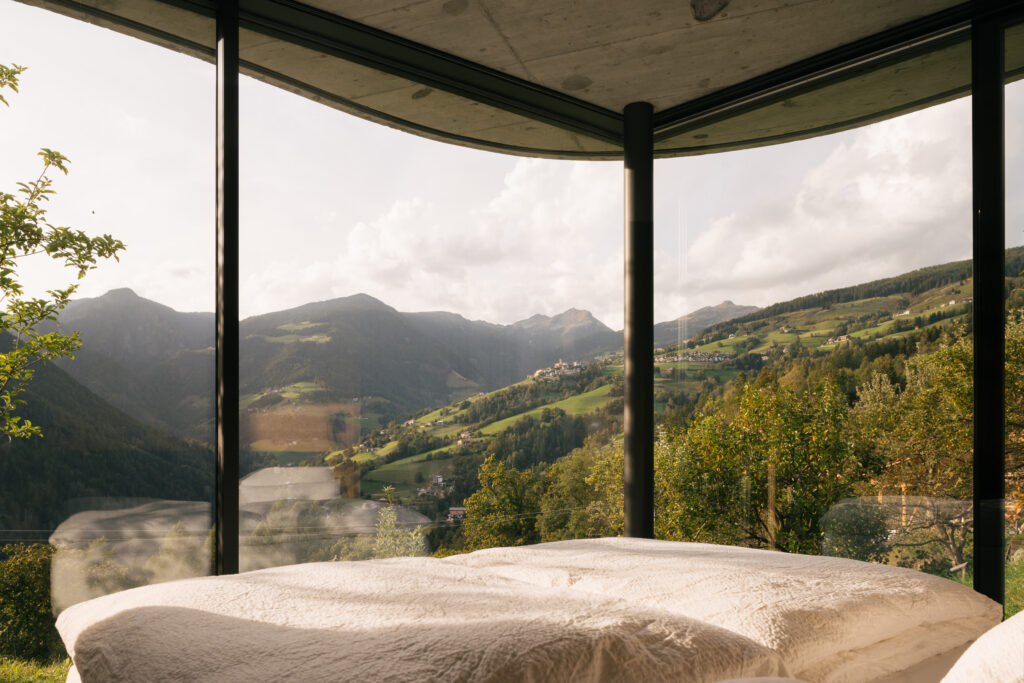 Verdings, un tipico villaggio altoatesino situato sopra la città di Chiusa, è immerso in un paesaggio straordinario: vigneti e boschi di castagni si adagiano sui pendii soleggiati, formando un quadro pittoresco insieme a cime rocciose, masi sparsi qua e là, verdi pascoli alpini. Il panorama è arricchito dalle Alpi Sarentine da un lato e dalle spettacolari vette delle Dolomiti dall’altro, che creano un’atmosfera perfetta per rallentare il ritmo della vita e trascorrere qualche giorno di vacanza in un rifugio speciale, in coppia o in famiglia. Nel Freiform Private Guesthouse di Martin e Anita Gruber, gli ospiti possono infatti lasciarsi alle spalle la frenesia quotidiana e immergersi nella tranquillità della natura altoatesina. Questo pavillon di vetro dal design contemporaneo è una vera e propria terrazza panoramica sulla Val di Tinne, un luogo dove i confini tra natura e architettura si dissolvono armoniosamente e dove la luce naturale è la vera protagonista. Con una superficie abitabile di 65 metri quadrati, il Freiform Private Guesthouse offre ampi spazi e un design raffinato, curato personalmente dalla proprietaria, Anita Gruber. Il progetto architettonico ha ricevuto il prestigioso premio “Best Architects 22 Award”.