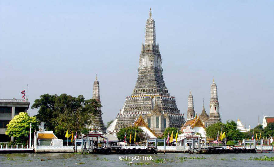 4) Wat Arun: è il tempio dell’alba, il più fotografato della città. Simbolo di Bangkok sorge sulle rive del fiume Chao Phraya in posizione opposta rispetto al palazzo reale e si raggiunge in barca. Il tempio risale al periodo di Ayutthaya e fu ampliato dai sovrani Rama II e Rama III. Il punto di riferimento del tempio è la pagoda centrale,“Pra Prang” ,alta 79 metri e rivestita di frammenti di porcellana che risplendono al sole.