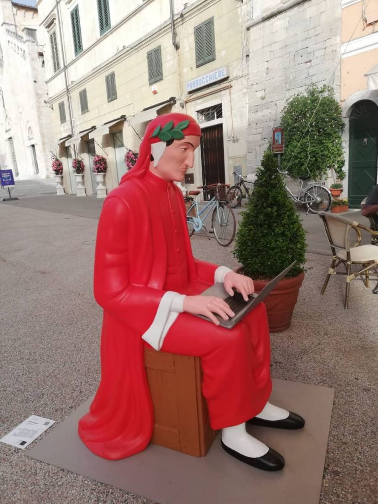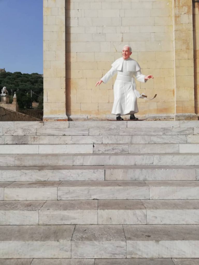 In mostra infatti si possono ammirare Dante Alighieri, di cui quest’anno ricorre l’anniversario dei 700 anni dalla morte, intento a scrivere la sua Divina Commedia su un portatile Macbook, Dolce e Gabbana, sulla falsa riga dell’altra celebre coppia artistica italo-inglese Gilbert & George, Charlie Chaplin con Venere, Biancaneve Assassina, il David di Michelangelo, Spider Man con suo figlio ed infine sul sagrato del Sant’Agostino Papa Francesco in skateboard.